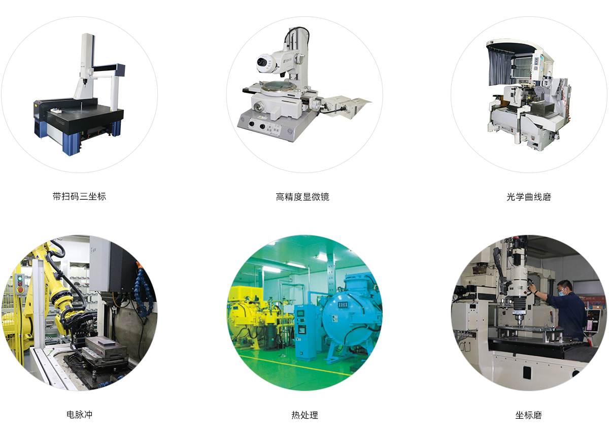 公司擁有慢走絲30臺、加工中心20多臺,電脈沖25臺,光曲磨2臺,數控成型磨1臺,并建有1個熱處理工場和1個表面處理工廠,主要設備均為瓦西諾(WASINO)、夏米爾(CHARMILLES)、牧野( MAKINO )、沙迪克(SODICK)、摩爾(MOORE)等國際知名品牌。尖端、精密的加工設備,結合先進的制造軟件,形成了強大 的制造能力。